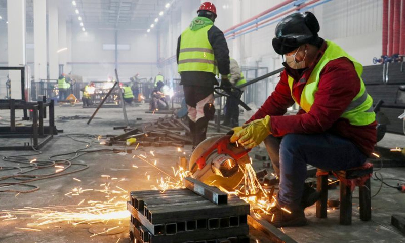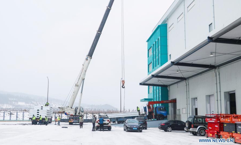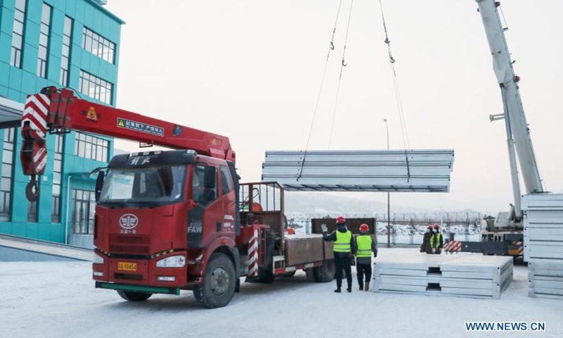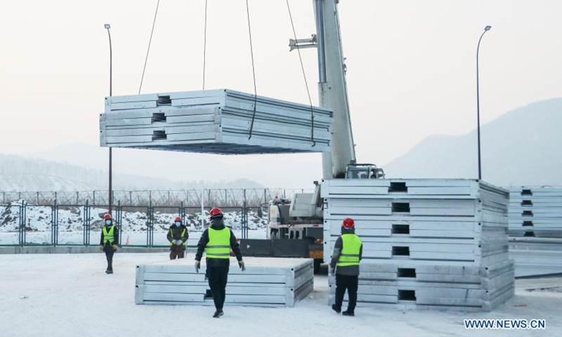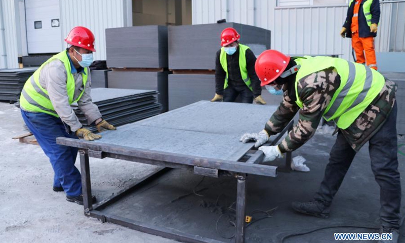 Workers work at the construction site of a COVID-19 quarantine center in Tonghua, northeast China's Jilin Province, Jan. 22, 2021. With 1,186 quarantine rooms, the COVID-19 quarantine center in Tonghua is expected to complete construction on Jan. 27.Photo:Xinhua