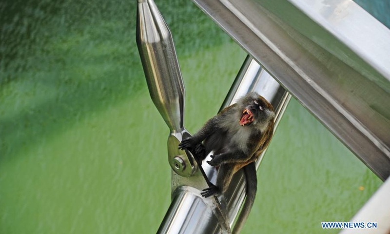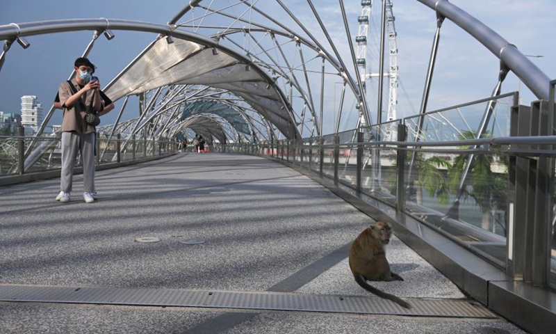 A wild long-tail macaque forages on the Helix Bridge in Singapore's Marina Bay on Jan. 22, 2021. (Photo by Then Chih Wey/Xinhua)