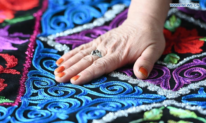 An artisan demonstrates Kazakh embroideries at a village cooperative in Baiquan Village, Jimsar County, Changji Hui Autonomous Prefecture, northwest China's Xinjiang Uygur Autonomous Region, Jan. 23, 2021. Production of the Kazakh embroidery, a national intangible cultural heritage, has helped female members of the village cooperative increase income. (Xinhua/Ding Lei)
