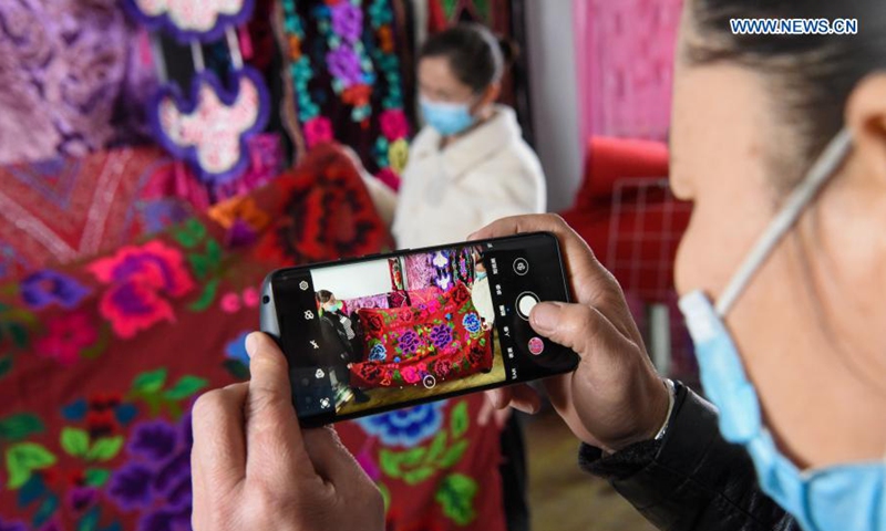 An artisan takes photos of a customized Kazakh embroidery for a client at a village cooperative in Baiquan Village, Jimsar County, Changji Hui Autonomous Prefecture, northwest China's Xinjiang Uygur Autonomous Region, Jan. 23, 2021. Production of the Kazakh embroidery, a national intangible cultural heritage, has helped female members of the village cooperative increase income. (Xinhua/Ding Lei)