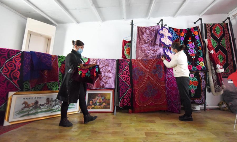 Artisans prepare for a Kazakh embroidery show at a village cooperative in Baiquan Village, Jimsar County, Changji Hui Autonomous Prefecture, northwest China's Xinjiang Uygur Autonomous Region, Jan. 23, 2021. Production of the Kazakh embroidery, a national intangible cultural heritage, has helped female members of the village cooperative increase income. (Xinhua/Ding Lei)