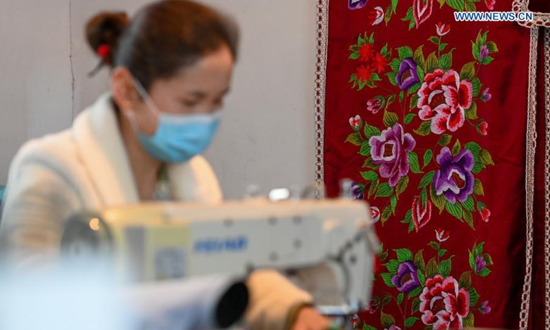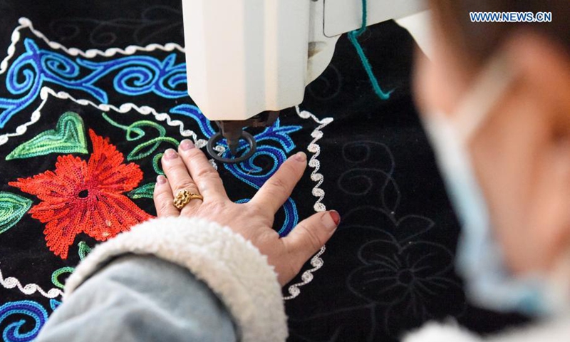 An artisan works on a Kazakh embroidery at a village cooperative in Baiquan Village, Jimsar County, Changji Hui Autonomous Prefecture, northwest China's Xinjiang Uygur Autonomous Region, Jan. 23, 2021. Production of the Kazakh embroidery, a national intangible cultural heritage, has helped female members of the village cooperative increase income. (Xinhua/Ding Lei)