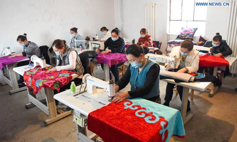 Artisans work on Kazakh embroideries at a village cooperative in Baiquan Village, Jimsar County, Changji Hui Autonomous Prefecture, northwest China's Xinjiang Uygur Autonomous Region, Jan. 23, 2021. Production of the Kazakh embroidery, a national intangible cultural heritage, has helped female members of the village cooperative increase income. (Xinhua/Ding Lei)