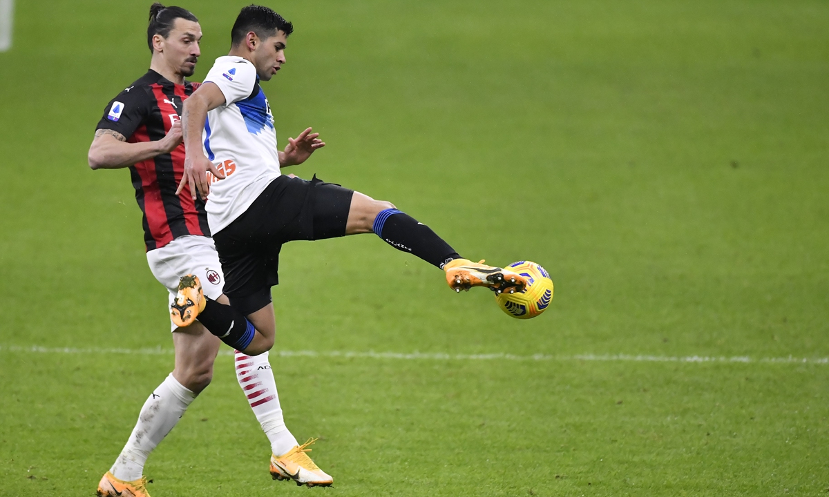 Zlatan Ibrahimovic (left) of AC Milan competes for the ball with Cristian Romero of Atalanta on Saturday in Milan, Italy. Photo: VCG