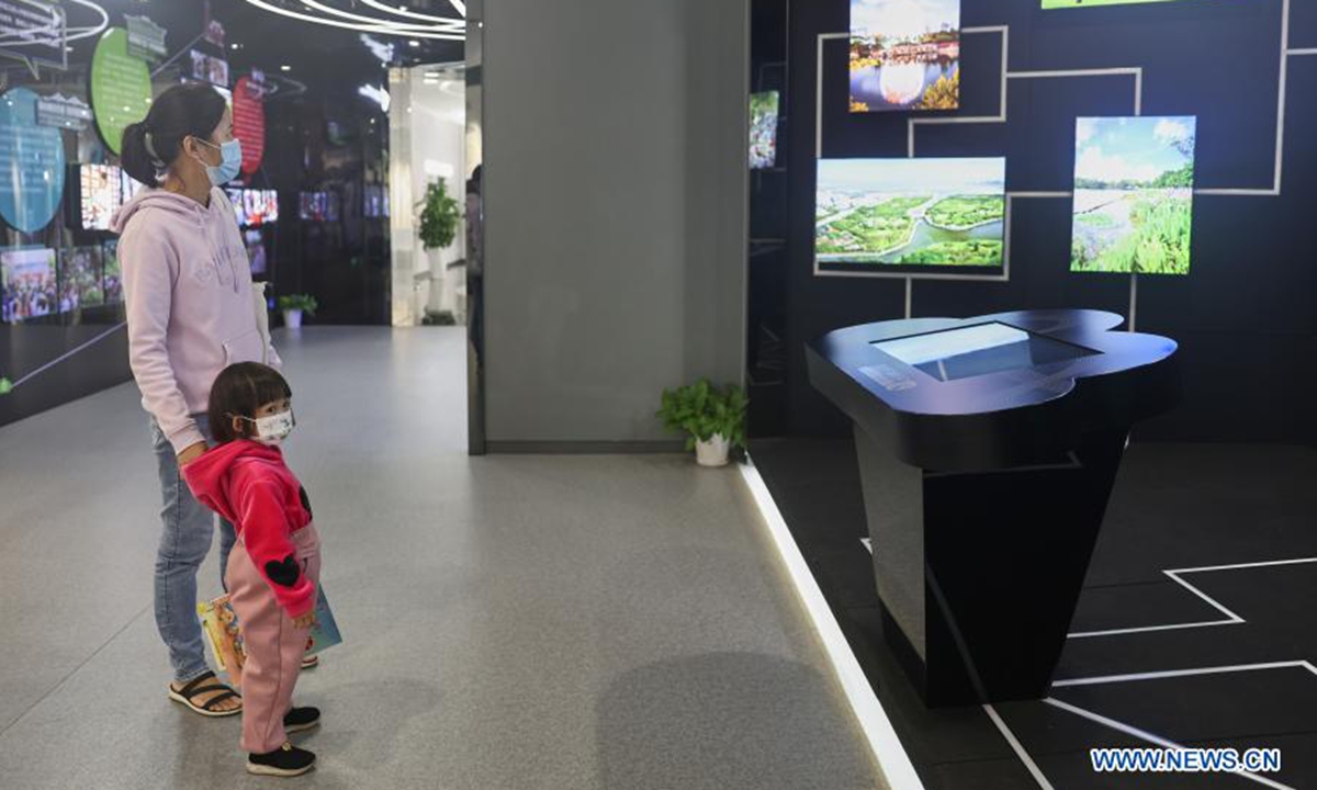 A woman and her child watch items displayed at the Longhua Cultural Museum in Haikou, capital city of south China's Hainan Province, Jan. 24, 2021. Museums in Haikou became attractive to children during their winter vacation. (Xinhua/Zhang Liyun)