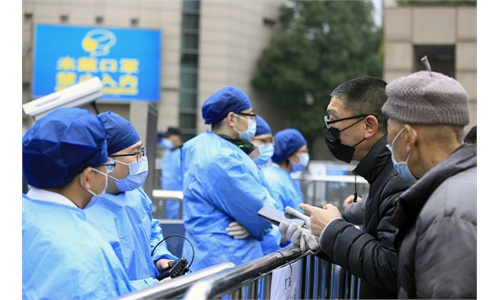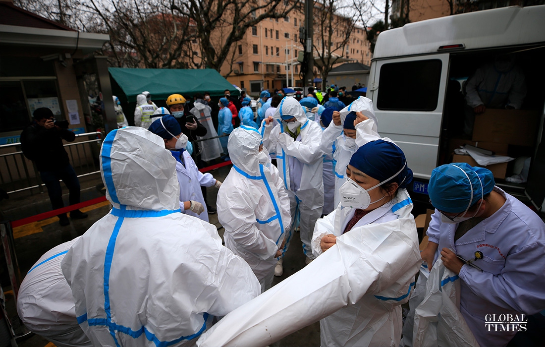Medical workers prepare to give residents in Shanghai nucleic acid tests. Photo: Yang Hui/GT