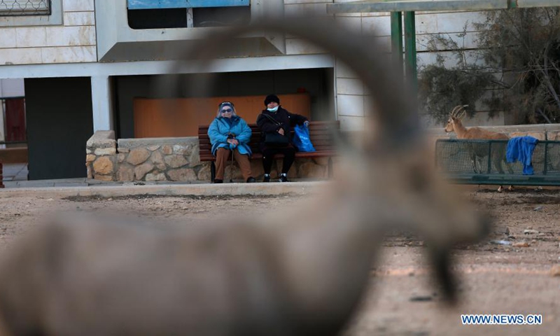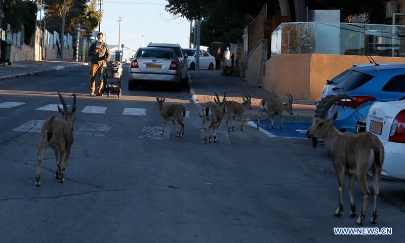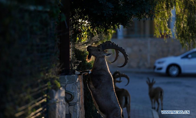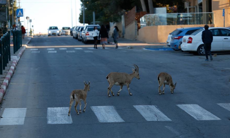 Nubian ibexes are seen on a street in Mitzpe Ramon, southern Israel, on Jan. 23, 2021, as many people stay at home during a full lockdown to fight COVID-19. (Photo by Muammar Awad/Xinhua)