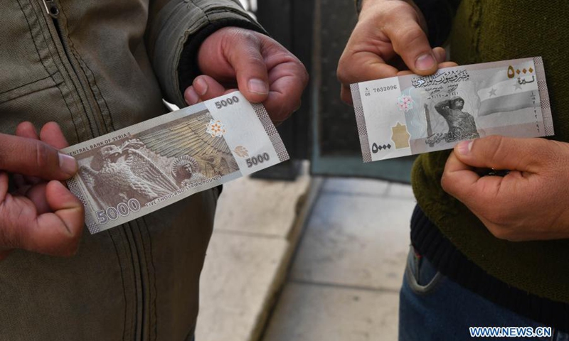 Syrians show new banknotes of 5,000 Syrian pounds in Damascus, Syria, on Jan. 24, 2021. The Central Bank of Syria on Sunday issued a new financial note for 5,000 Syrian pounds as part of the measures to confront inflation, according to the bank statement. (Photo by Ammar Safarjalani/Xinhua)