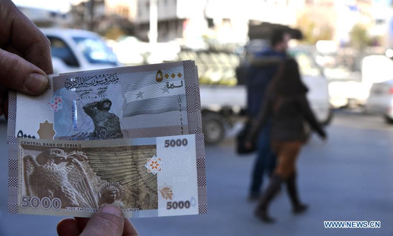 A man looks at new banknotes of 5,000 Syrian pounds in Damascus, Syria, on Jan. 24, 2021. The Central Bank of Syria on Sunday issued a new financial note for 5,000 Syrian pounds as part of the measures to confront inflation, according to the bank statement. (Photo by Ammar Safarjalani/Xinhua)
