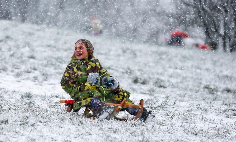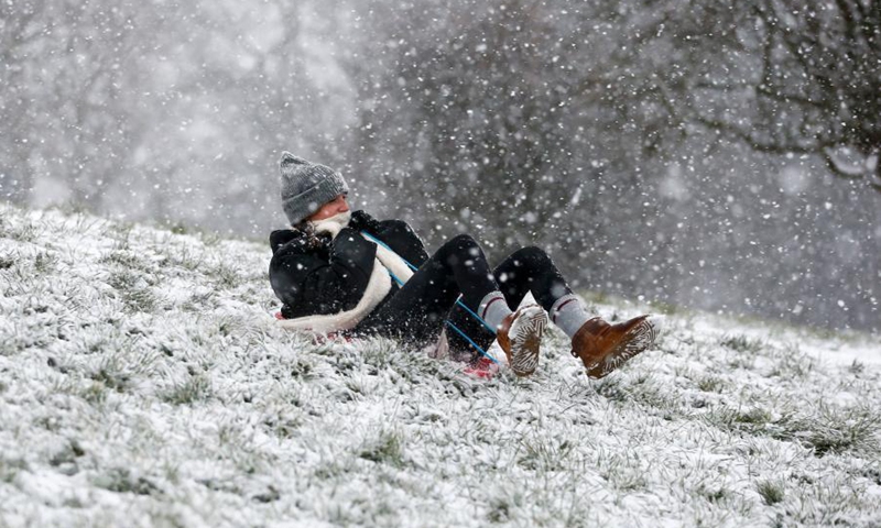 A girl sledges down the hill in London, Britain, on Jan. 24, 2021. (Xinhua/Han Yan)