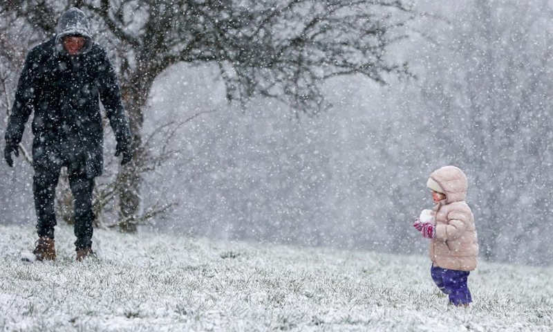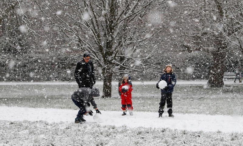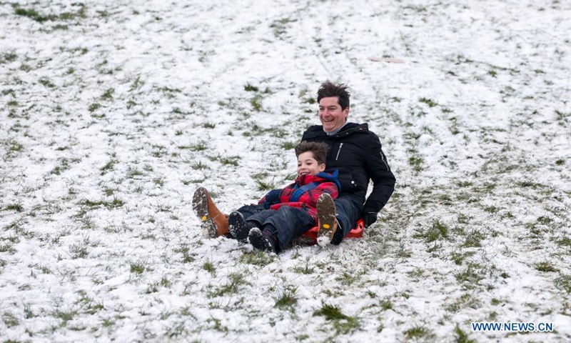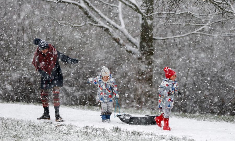 People enjoy the snow in London, Britain, on Jan. 24, 2021. (Xinhua/Han Yan)