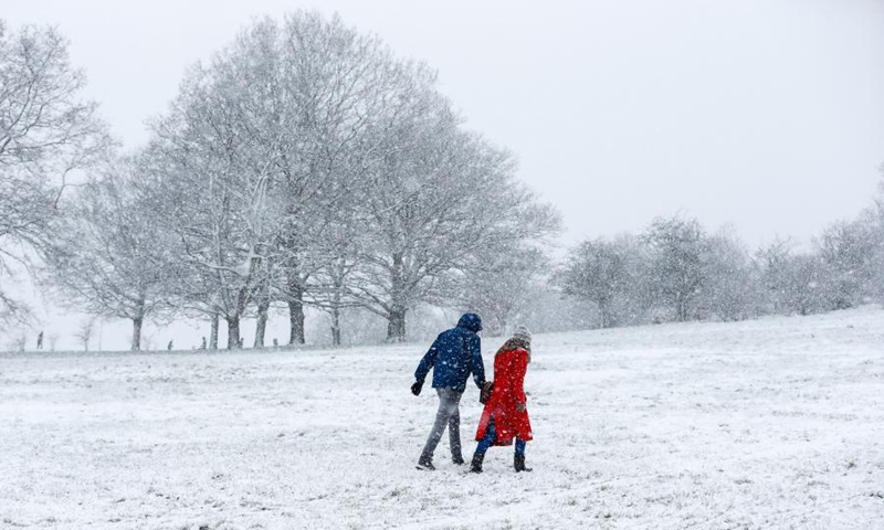 People walk in the snow in London, Britain, on Jan. 24, 2021. (Xinhua/Han Yan)