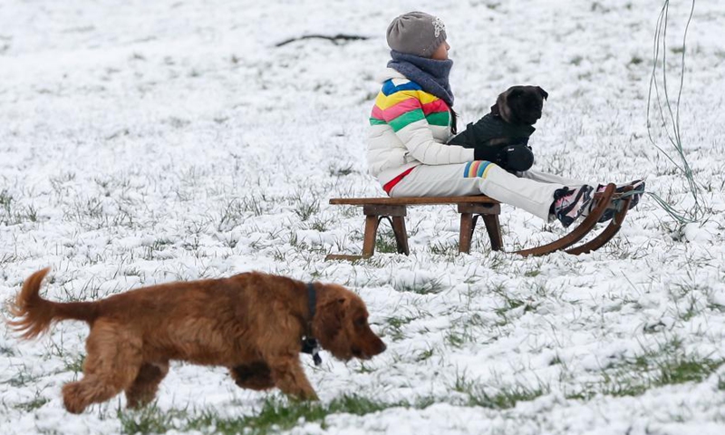 A child sits on a sleigh with a dog running around in the snow in London, Britain, on Jan. 24, 2021. (Xinhua/Han Yan)