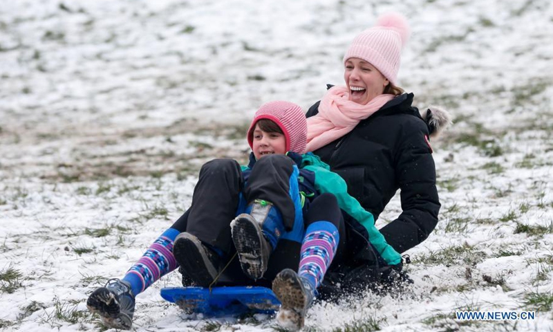 People sledge down the hill in London, Britain, on Jan. 24, 2021. (Xinhua/Han Yan)