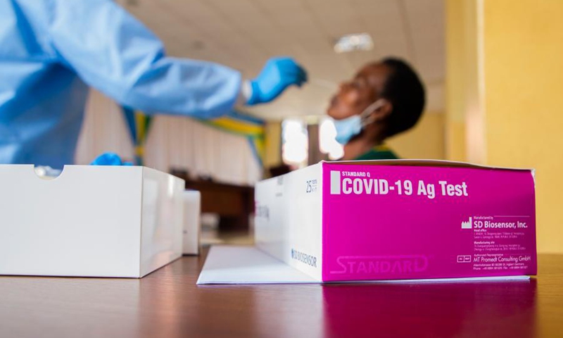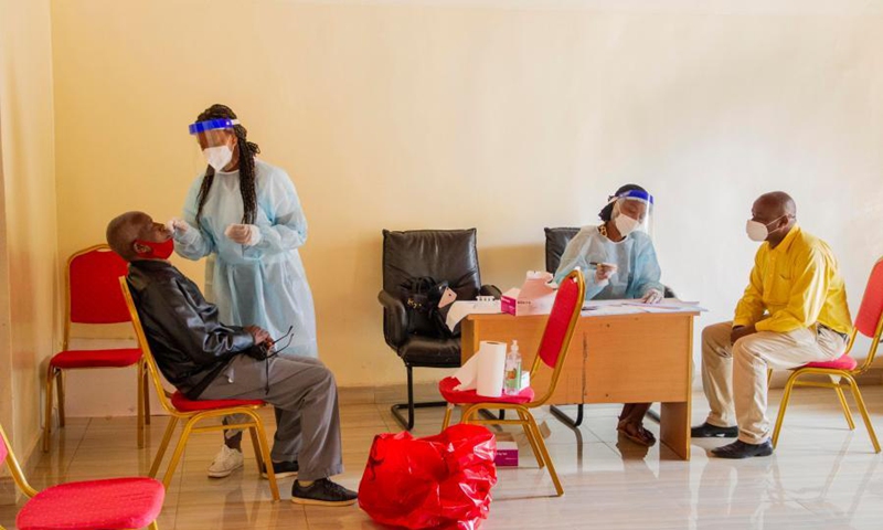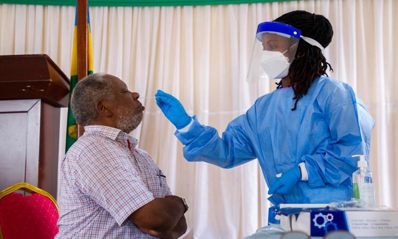 A person receives a free COVID-19 test in Kigali, capital city of Rwanda, on Jan. 23, 2021. The Rwandan Biomedical Center on Saturday launched free COVID-19 tests in the capital city Kigali on the elderly people aged 70 years and above and those with chronic diseases to ascertain the COVID-19 transmission among them. (Photo by Cyril Ndegeya/Xinhua)