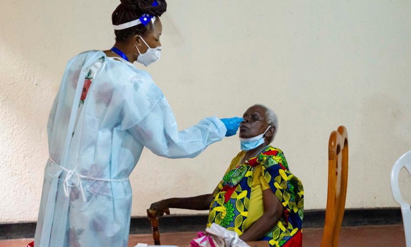 An elderly person receives a free COVID-19 test in Kigali, capital city of Rwanda, on Jan. 23, 2021. The Rwandan Biomedical Center on Saturday launched free COVID-19 tests in the capital city Kigali on the elderly people aged 70 years and above and those with chronic diseases to ascertain the COVID-19 transmission among them. (Photo by Cyril Ndegeya/Xinhua)