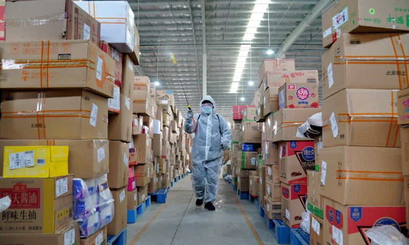 A staff of Shijiazhuang distribution center of Cainiao Network, the logistics platform of e-commerce giant Alibaba, disinfects packages in Shijiazhuang, north China's Hebei Province, Jan. 23, 2021. Logistics companies in Shijiazhuang have strengthened disinfection measures as the COVID-19 prevention and control efforts to make sure the safety of their employees and customers. (Xinhua/Mu Yu)