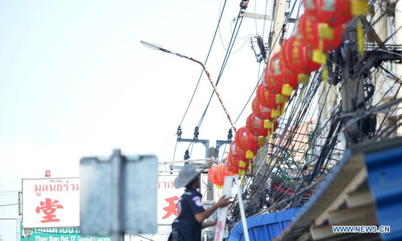 A staff member puts up lanterns to decorate a street for the upcoming Chinese Lunar New Year in Bangkok, Thailand, Jan. 25, 2021. (Xinhua/Rachen Sageamsak)