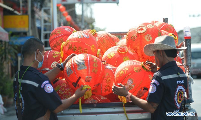 Staff members arrange lanterns to decorate a street for the upcoming Chinese Lunar New Year in Bangkok, Thailand, Jan. 25, 2021. (Xinhua/Rachen Sageamsak)