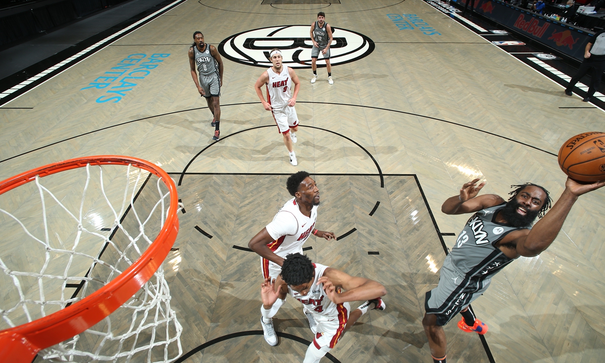 James Harden of the Brooklyn Nets shoots the ball against the Miami Heat on Monday in Brooklyn, New York City. Photo: AFP