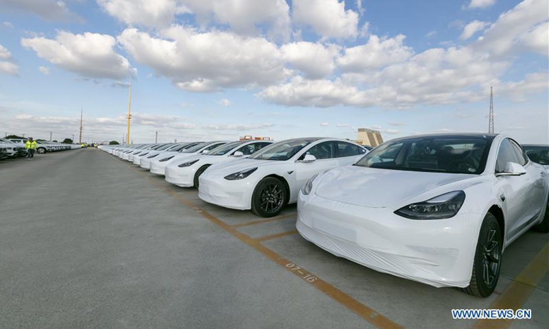 Photo taken on Oct. 19, 2020 shows the Tesla China-made Model 3 vehicles which will be exported to Europe at Waigaoqiao port in Shanghai, east China, Oct. 19, 2020. U.S. carmaker Tesla announced on Monday that it would export the made-in-China Model 3 to Europe, marking another important milestone for its Shanghai Gigafactory. The first batch of exported sedans will leave Shanghai next Tuesday and arrive at the port of Zeebrugge in Belgium at the end of November before being sold in European countries, including Germany, France, Italy, Spain, Portugal, and Switzerland. (Xinhua/Wang Xiang)