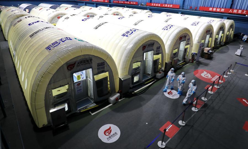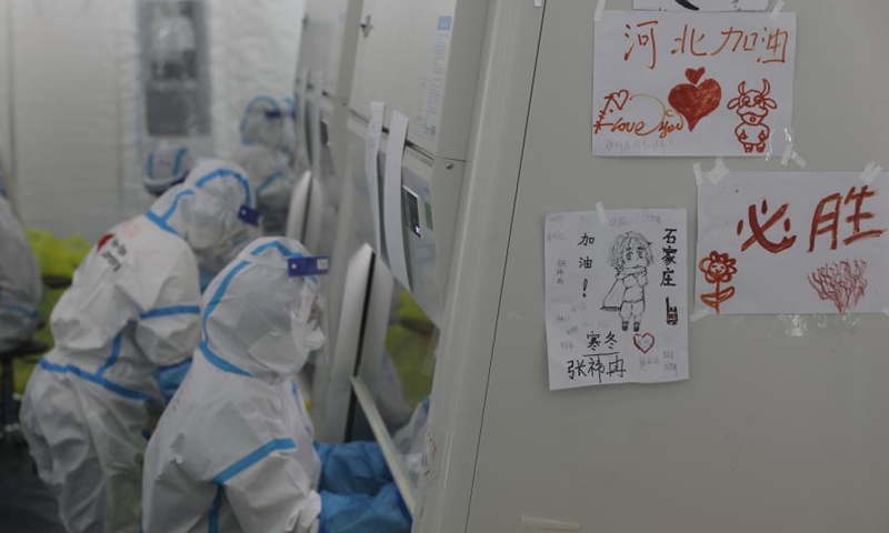 Medical workers walk past the nucleic acid test laboratory named Huoyan, or Fire Eye, in Shijiazhuang, north China's Hebei Province, Jan. 26, 2021. As of Jan. 22, a total of 5.28 million nucleic acid samples have been tested in Shijiazhuang's "Huoyan" laboratory since it was put into use from Jan. 8. (Xinhua/Yang Shiyao)
