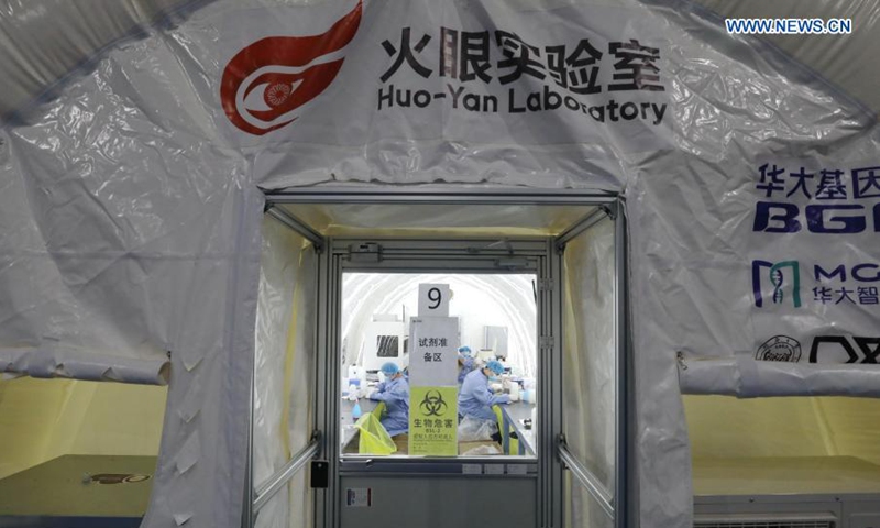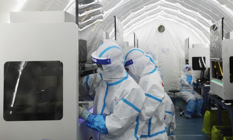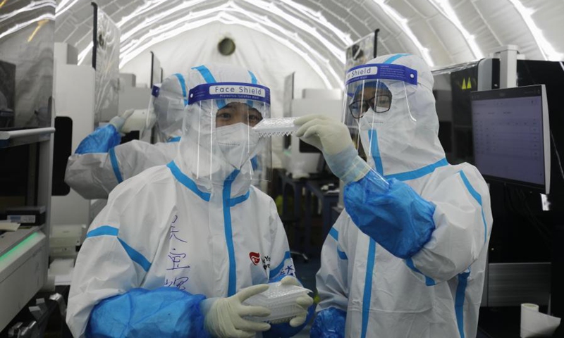 Medical workers work at the nucleic acid test laboratory named Huoyan, or Fire Eye, in Shijiazhuang, north China's Hebei Province, Jan. 26, 2021. As of Jan. 22, a total of 5.28 million nucleic acid samples have been tested in Shijiazhuang's "Huoyan" laboratory since it was put into use from Jan. 8. (Xinhua/Yang Shiyao)