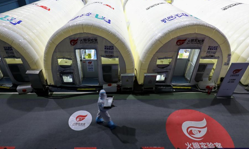 A medical worker walks past the nucleic acid test laboratory named Huoyan, or Fire Eye, in Shijiazhuang, north China's Hebei Province, Jan. 26, 2021. As of Jan. 22, a total of 5.28 million nucleic acid samples have been tested in Shijiazhuang's "Huoyan" laboratory since it was put into use from Jan. 8. (Xinhua/Yang Shiyao)