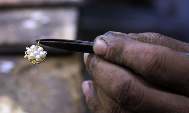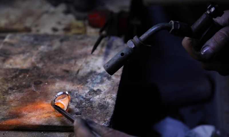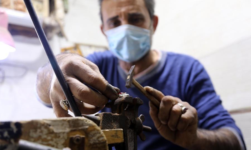 An artisan works on a piece of jewelry at his workshop in Baghdad, Iraq, Jan. 26, 2021. (Xinhua)