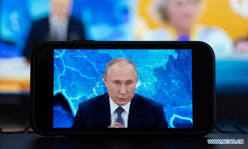 Photo taken on Dec. 17, 2020 in Moscow, Russia shows the live broadcast of Russian President Vladimir Putin speaking during his annual press conference. This year, due to coronavirus-related restrictions, Putin's annual year-end press conference was held online on Thursday. (Xinhua/Bai Xueqi)