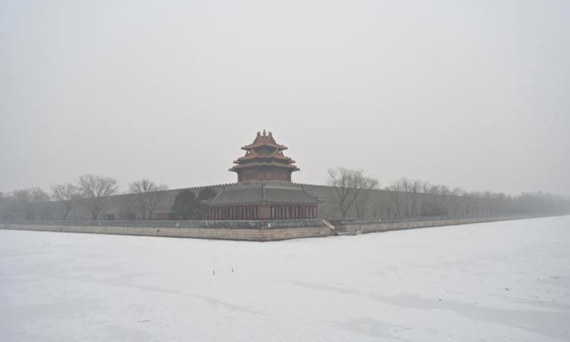 A turret of the Palace Museum is pictured amid falling snow in Beijing, capital of China, Jan. 25, 2021. (Xinhua/Li Xin)