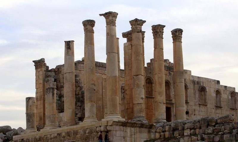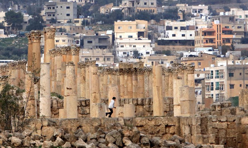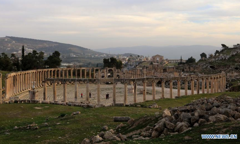 Photo taken on Jan. 26, 2021 shows the Roman archeological site in Jerash, Jordan. The ruined city of Jerash is Jordan's largest Roman archeological site, which has ceremonial gates, colonnaded avenues, temples and theaters. (Photo by Mohammad Abu Ghosh/Xinhua)