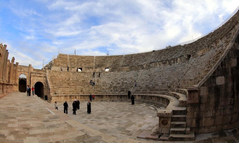 Tourists visit the Roman archeological site in Jerash, Jordan, Jan. 26, 2021. The ruined city of Jerash is Jordan's largest Roman archeological site, which has ceremonial gates, colonnaded avenues, temples and theaters. (Photo by Mohammad Abu Ghosh/Xinhua)