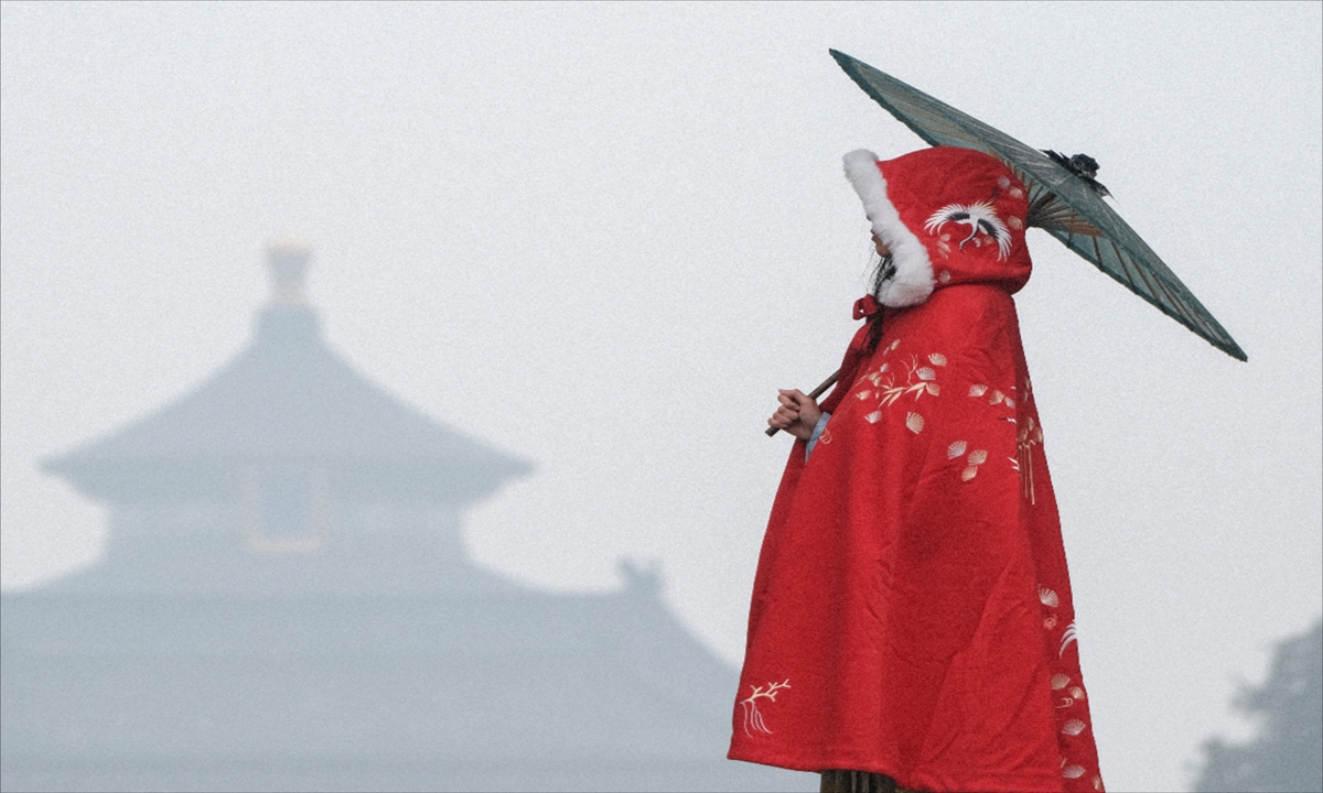 A woman with a retro red embroidered cloak holding an oil paper umbrella stands in the snow in Beijing's Temple of Heaven Park on Monday, as if she has just traveled from ancient times. Photo: IC