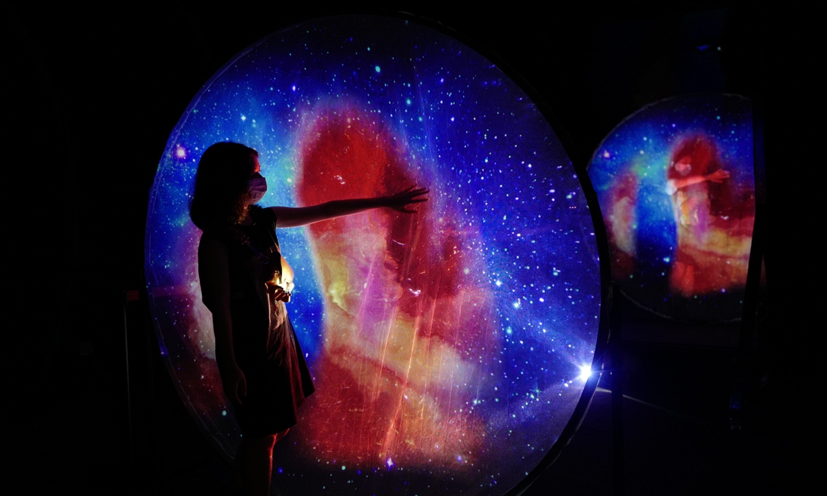 A woman visits an exhibition named "COSMOS" in Shenzhen, South China's Guangdong Province. The exhibition offers visitors an interactive experience, allowing them to see every aspect of the world, from tiny particles to the entire universe. Photo: IC