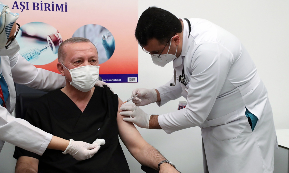 Turkish President Recep Tayyip Erdogan receives his COVID-19 vaccine developed by China's Sinovac on January 14. Photo: Xinhua