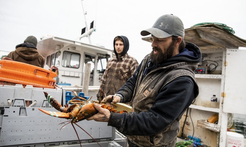 A worker of Stonington Lobster Coop examines a lobster at a dock in Stonington of Maine, the United States, Feb. 4, 2020.(Photos: Xinhua)