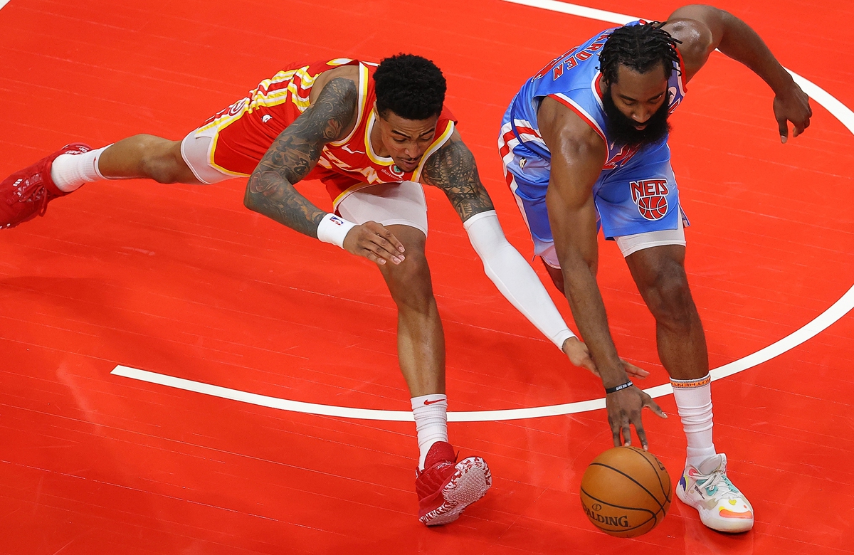 John Collins (left) of the Atlanta Hawks battles for a loose ball against James Harden of the Brooklyn Nets on Wednesday in Atlanta, Georgia. Photo: AFP