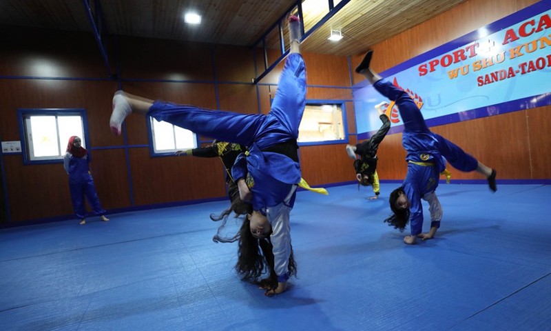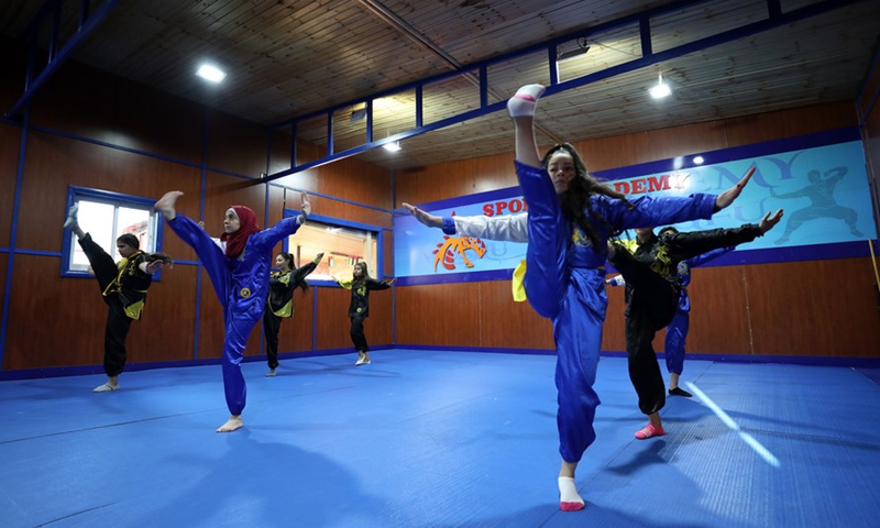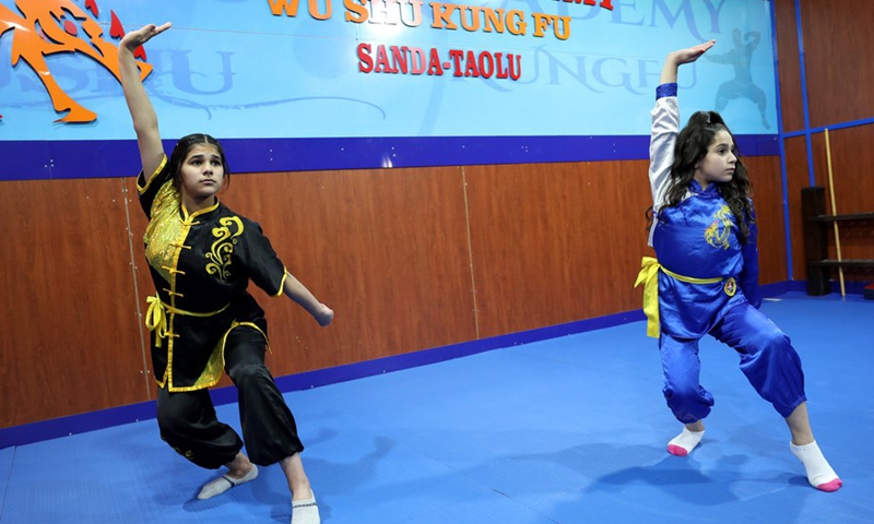Palestinian girls are practicing Chinese martial arts, or Wushu, at a sports center in the West Bank city of Ramallah, on Jan. 27, 2021.Photo:Xinhua