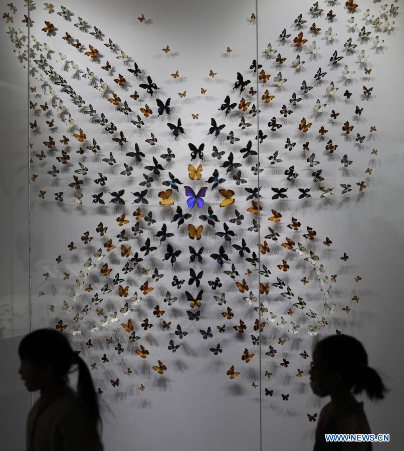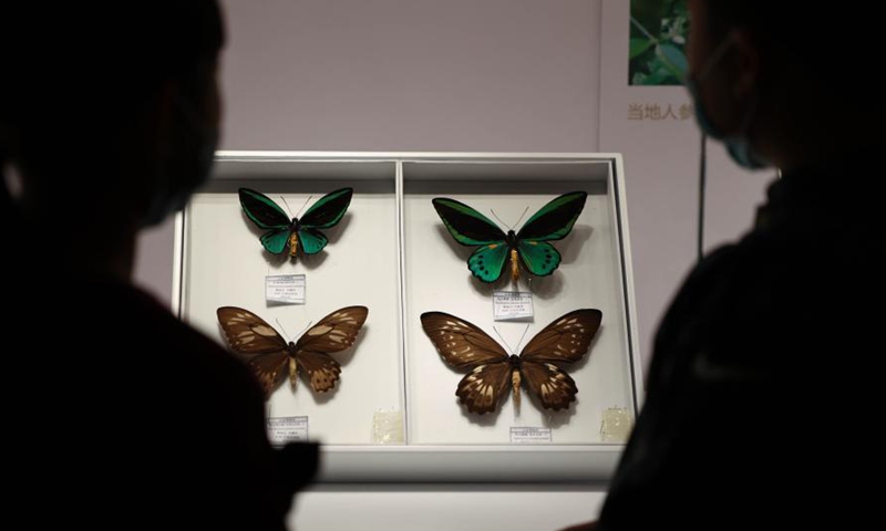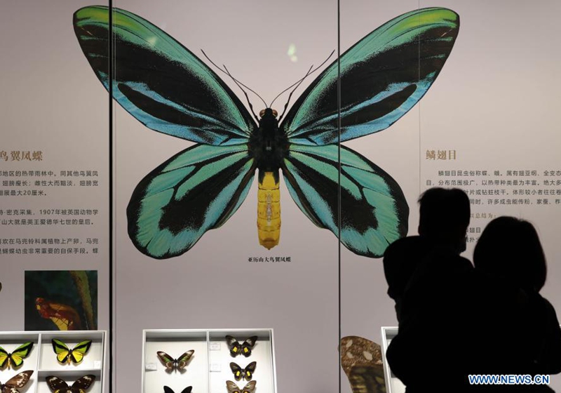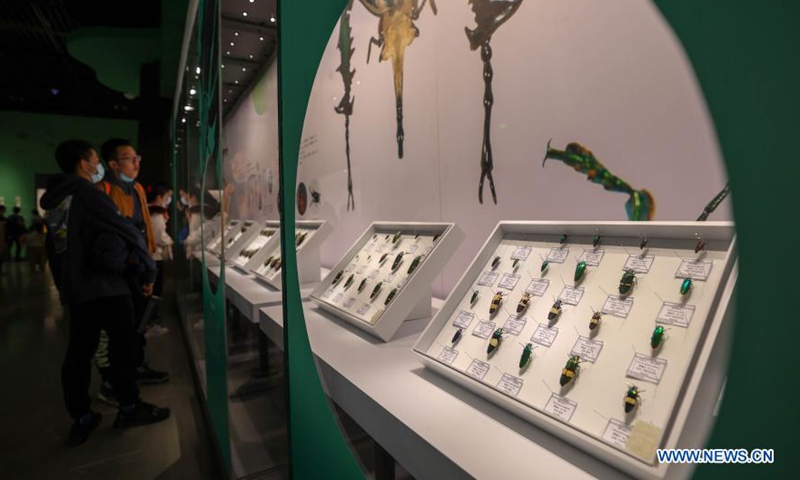 Visitors view insect specimens at the Shandong Museum in Jinan, east China's Shandong Province, Jan. 29, 2021. An exhibition featuring rare insect specimens kicked off here on Friday, with over 1,000 pieces of insect specimens from more than 30 countries and regions. (Xinhua/Zhu Zheng)