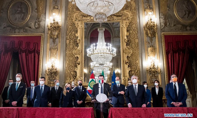 The League party's leader Matteo Salvini (C) speaks to the media at the Quirinale Palace in Rome, Italy, on Jan. 29, 2021. Italian President Sergio Mattarella has given House Speaker Roberto Fico an exploratory mandate to verify whether the same governing majority that existed before Prime Minister Giuseppe Conte resigned on Jan. 26 is still workable.Photo:Xinhua