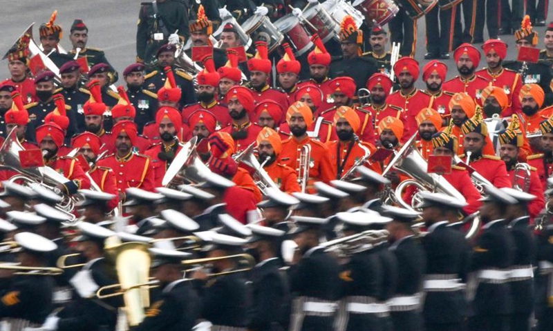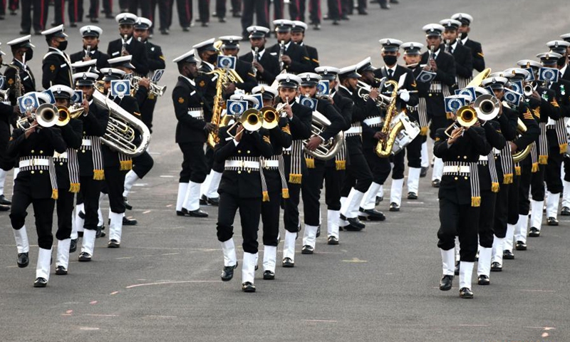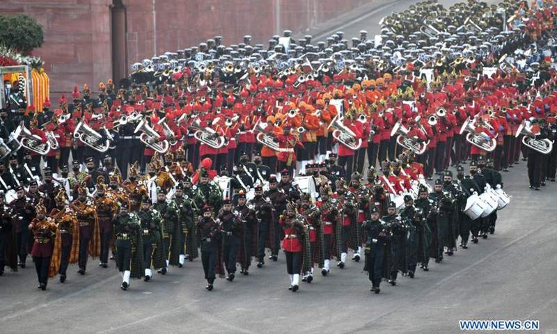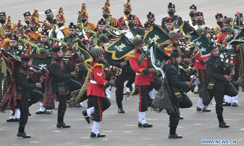 The beating retreat ceremony is held at Raisina Hills, marking the end of the Republic Day parade, in New Delhi, India, on Jan. 29, 2021.Photo:Xinhua