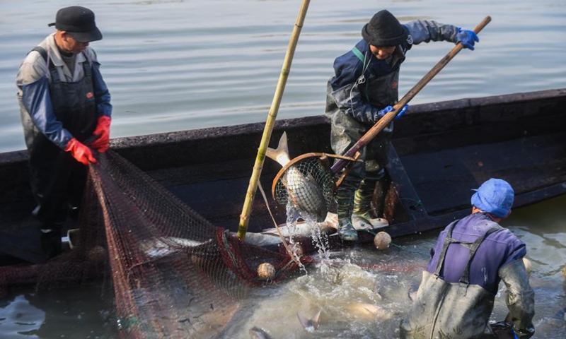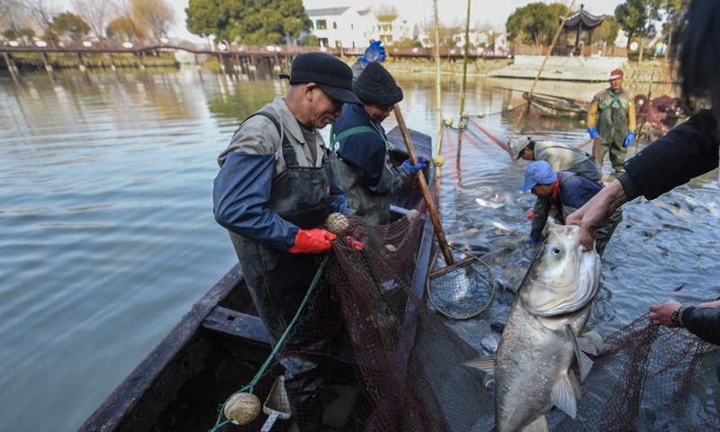 Villagers catch fish to prepare for traditional fish soup and fish balls in Quanyi Village of Donglin Town in Huzhou, east China's Zhejiang Province, Jan. 30, 2021. A folk culture event was held in Quanyi Village Saturday to welcome the Chinese Lunar New Year. Villagers make traditional food with fresh fish and serve them to the elderly and staff from other cities in local nursing home. (Xinhua/Xu Yu)