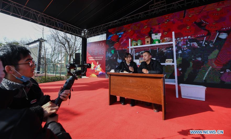 People sell local agricultural products via livestream in Quanyi Village of Donglin Town in Huzhou, east China's Zhejiang Province, Jan. 30, 2021. A folk culture event was held in Quanyi Village Saturday to welcome the Chinese Lunar New Year. Villagers make traditional food with fresh fish and serve them to the elderly and staff from other cities in local nursing home. (Xinhua/Xu Yu)