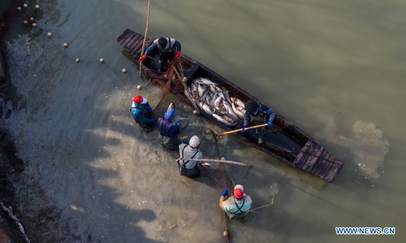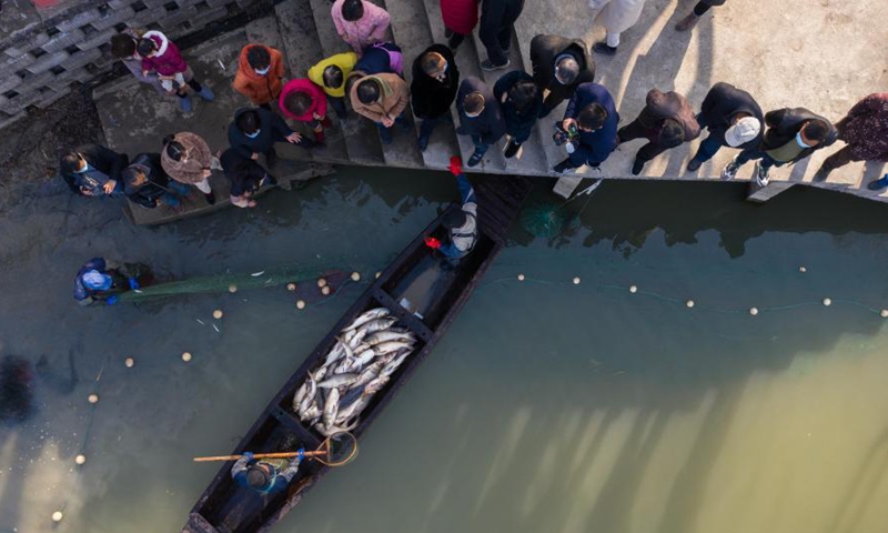 Aerial photo shows villagers catching fishes to prepare traditional fish soup and fish balls in Quanyi Village of Donglin Town in Huzhou, east China's Zhejiang Province, Jan. 30, 2021. A folk culture event was held in Quanyi Village Saturday to welcome the Chinese Lunar New Year. Villagers make traditional food with fresh fish and serve them to the elderly and staff from other cities in local nursing home. (Xinhua/Xu Yu)