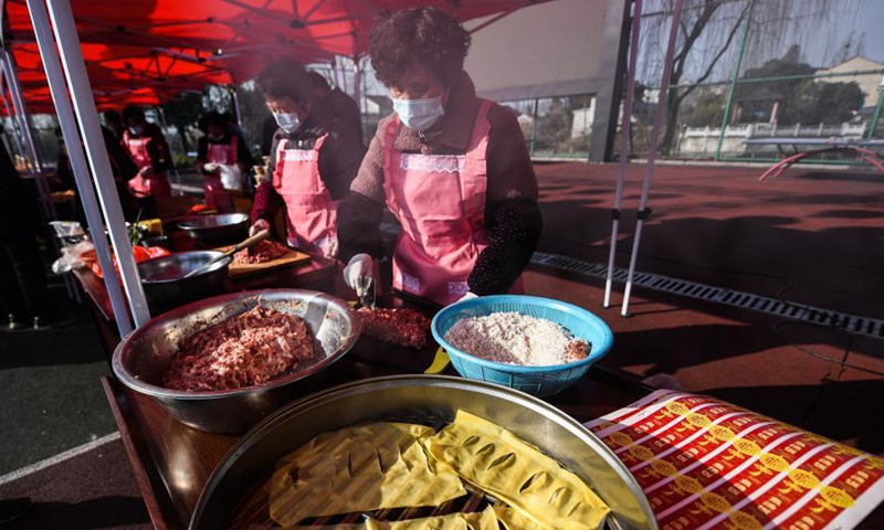 Villagers make traditional meat balls in Quanyi Village of Donglin Town in Huzhou, east China's Zhejiang Province, Jan. 30, 2021. A folk culture event was held in Quanyi Village Saturday to welcome the Chinese Lunar New Year. Villagers make traditional food with fresh fish and serve them to the elderly and staff from other cities in local nursing home. (Xinhua/Xu Yu)
