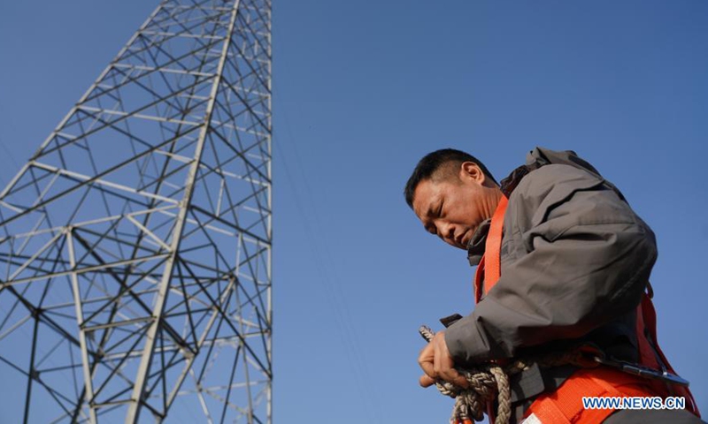 A worker gears up to install a monitor camera over a nest of the oriental white stork built on an electric pylon in Raofeng Township in Poyang County of east China's Jiangxi Province, Jan. 29, 2021. The camera is expected to regularly feed video images to researchers for studies of habits and breeding of the oriental white stork. More often than not, oriental white storks breeding in areas around the Poyang Lake choose to build their nests on electric pylons. The camera installation effort, a joint project between the Poyang Lake National Nature Reserve Administration Bureau and the Jiangxi provincial power company under the State Grid, aims to help observe and protect these birds. (Xinhua/Zhou Mi)