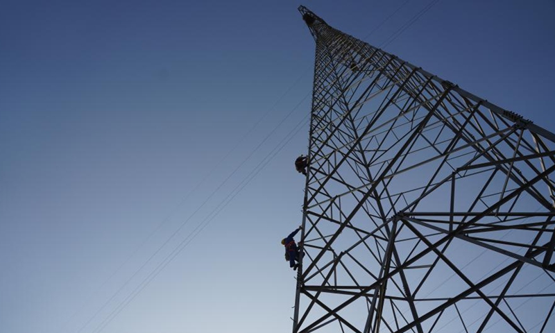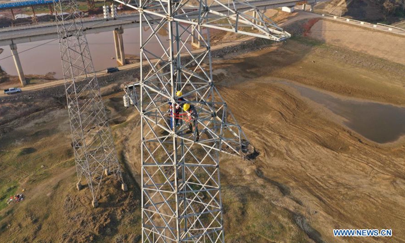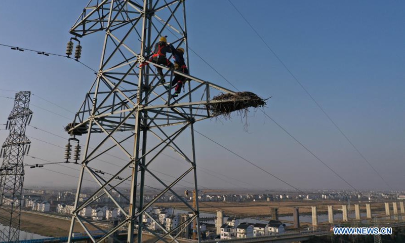 Two workers climb an electric pylon to install a monitor camera over a nest of the oriental white stork built on top of it in Raofeng Township in Poyang County of east China's Jiangxi Province, Jan. 29, 2021. (Xinhua/Zhou Mi)