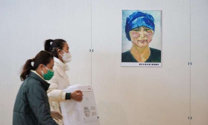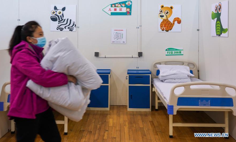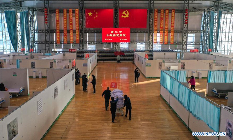 Staff members work at a temporary hospital converted from a gymnasium in Tonghua, northeast China's Jilin Province, Jan. 30, 2021. A local gymnasium has been converted into a temporary hospital for the 14-day rehabilitation of patients recovered from COVID-19. The hospital covers an area of 5,300 square meters and has 310 beds. (Xinhua/Xu Chang)