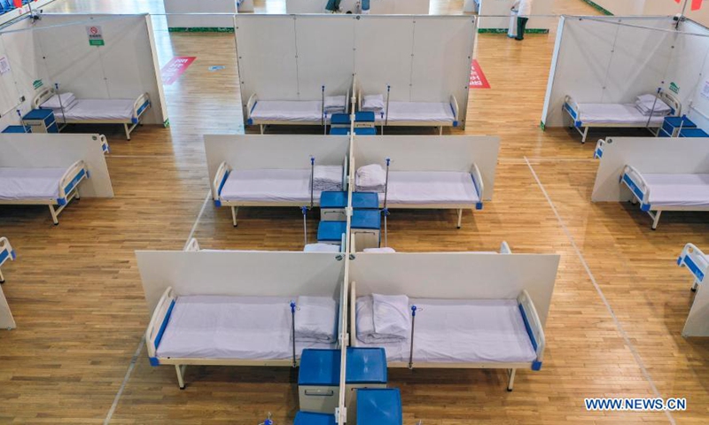 Aerial photo taken on Jan. 30, 2021 shows an interior view of a temporary hospital converted from a gymnasium in Tonghua, northeast China's Jilin Province. A local gymnasium has been converted into a temporary hospital for the 14-day rehabilitation of patients recovered from COVID-19. The hospital covers an area of 5,300 square meters and has 310 beds. (Xinhua/Xu Chang)